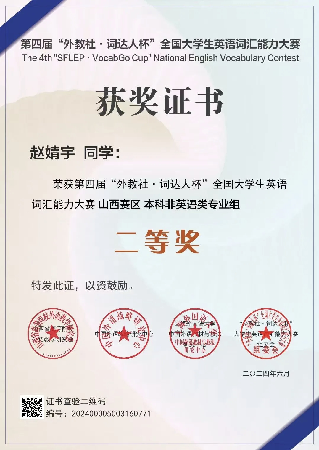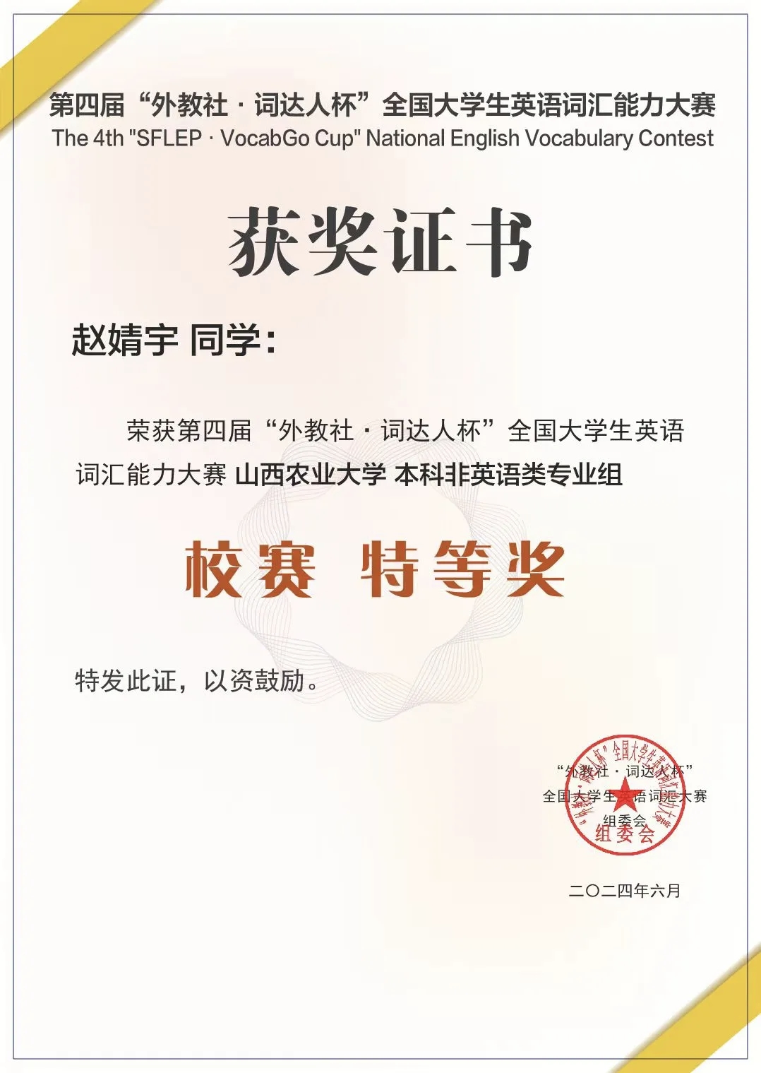 2024年:专业一等奖学金、“优秀学生”荣誉称号、“外语优秀奖”、第四届“外教社·词达人杯”全国大学生英语词汇能力大赛山西农业大学本科非英语专业组校赛特等奖、山西赛区二等奖