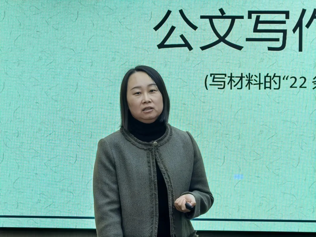 会上,荆立群以公文写作能力提升为核心,结合辅导员工作中公文应用实际,从规范要求、思维培养、实践转化三个维度展开系统性讲解。她提出公文写作需遵循平实严谨、简洁规范的风格导向,在文字使用、结构搭建、标题拟制等方面严格把控标准,强调要兼顾逻辑严谨的哲学思维与贴合政策导向的政治思维,确保公文内容符合规范。此外,她还提出辅导员团队要通过常态化学习与经验总结,将公文写作能力转化为工作实效,让各类公文材料真正成为推进工作的有力支撑。
