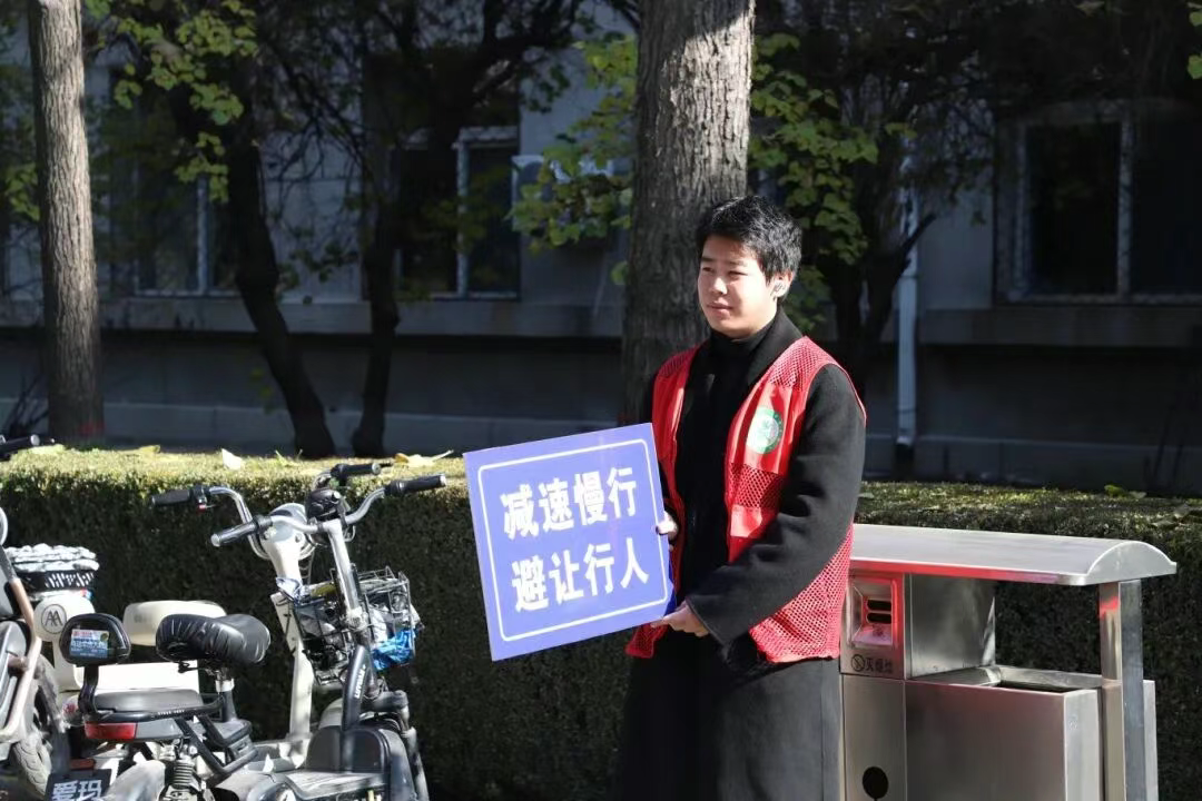 志愿者在校园主干道路有序开展宣传工作,他们手持“减速慢行,避让行人”“请勿逆行,安全随行”等醒目标语牌,向过往师生讲解校园交通规则、文明骑行事项及应急避险措施,并结合典型案例提醒大家警惕逆行、超速、违规占道等危险行为。通俗易懂的讲解吸引了众多学生聆听,面对同学们提出的道路交通安全问题,志愿者也逐一进行详细解答。最后,全体人员一同合影留念,为本次活动画上了圆满的句号。