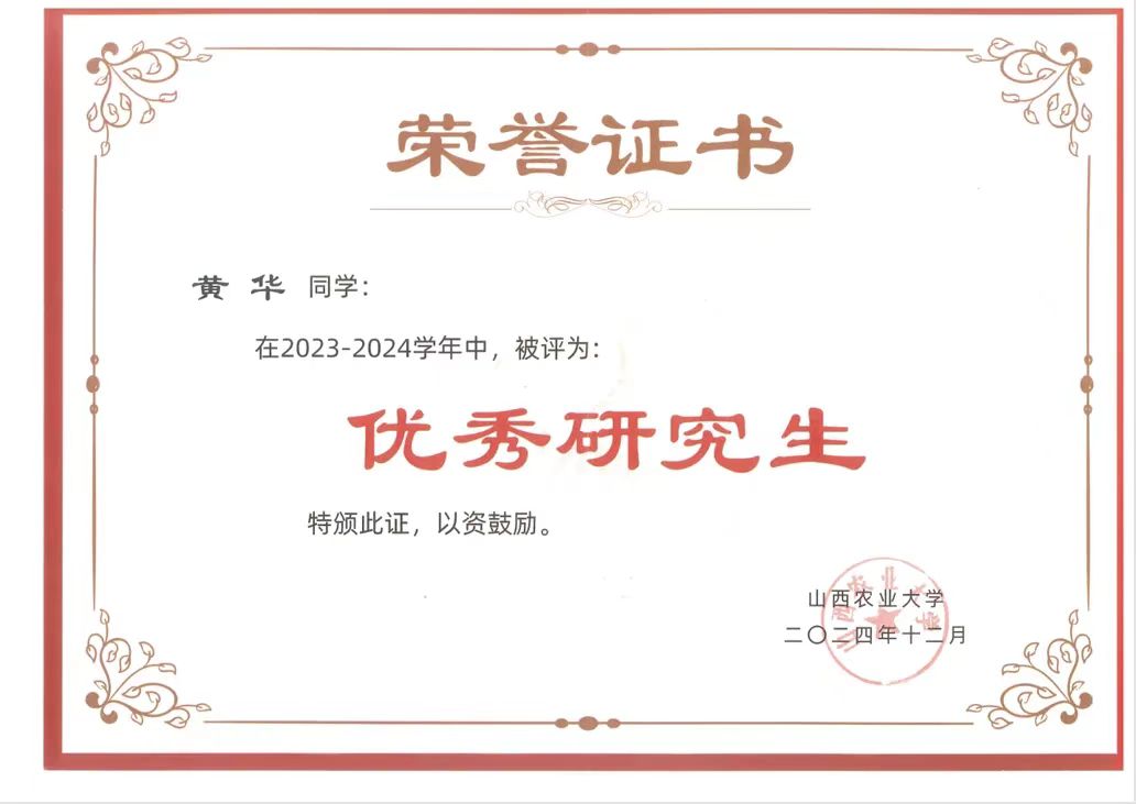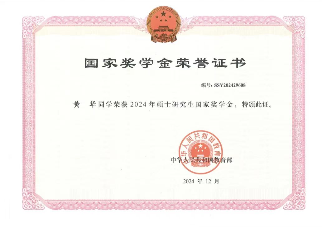 获2023-2024学年“优秀研究生”荣誉称号,获2023-2024学年一等奖学金、“2023-2024国家奖学金”荣誉称号。