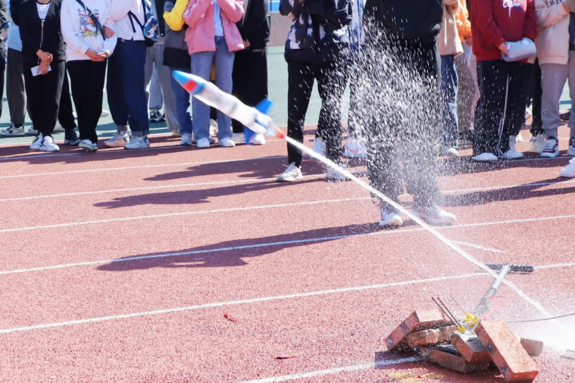 活动要求参赛班级使用废弃材料制作火箭以水为发射动力,创作过程中融入班级特色充分发挥创新能力。比赛要求各组进行一次试飞,两次比赛,取最远距离为最终成绩。比赛伊始,各组参赛人员纷纷对水火箭进行调整,寻找最合适的发射角度。伴着一阵阵爆破声响,水花四溅,各个参赛队伍的水火箭有序起飞,一个个火箭在空中划过了美丽的弧线,稳稳的落在地上,此时观众们呐喊声欢呼声不断。