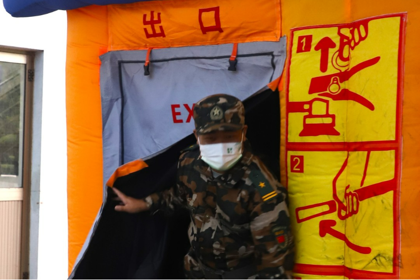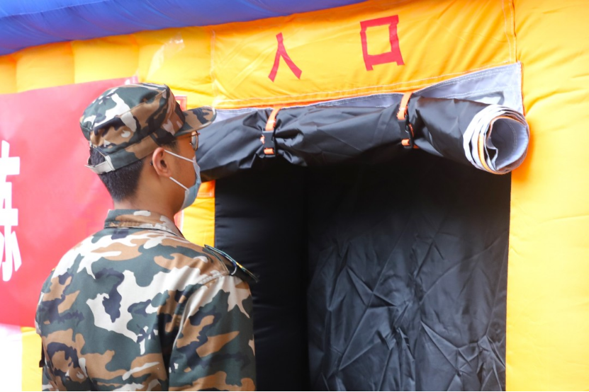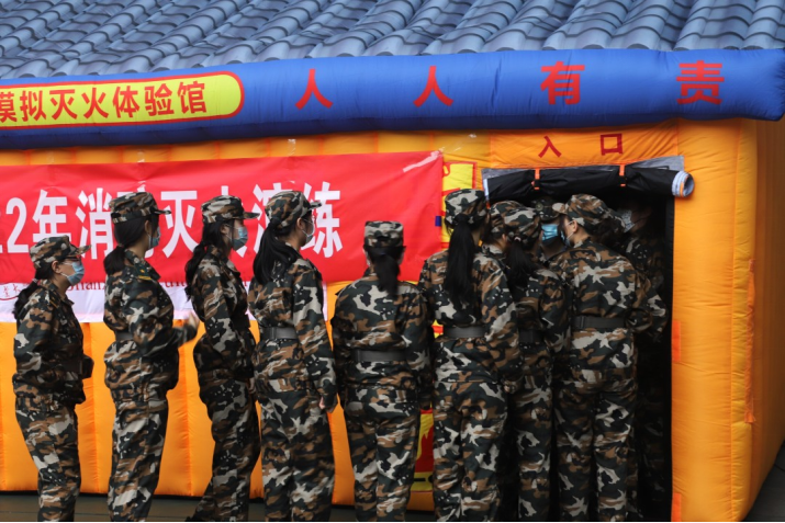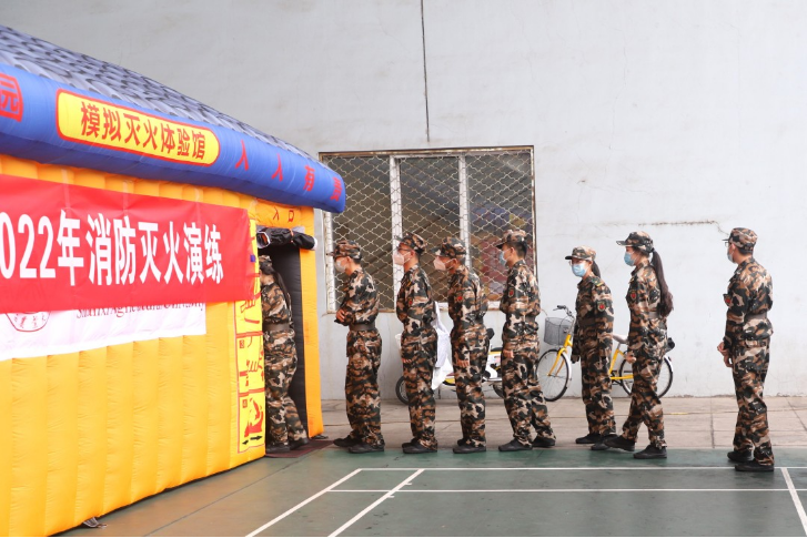 演练开始,同学们在模拟灭火体验馆中使用灭火器灭火,随后同学从火灾逃生体验馆中弯腰小步快走。途中,同学们冷静、有序、快速撤离。