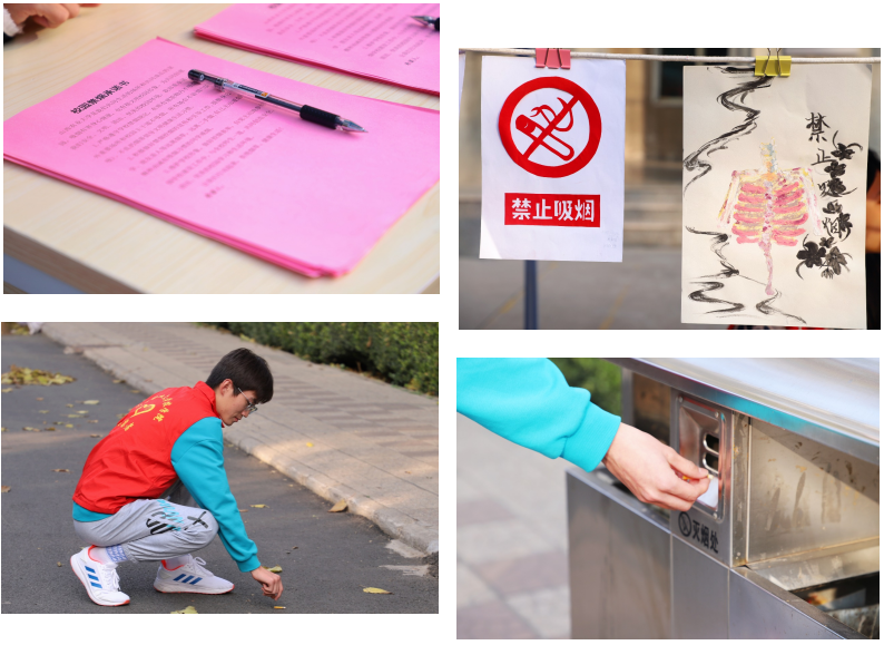主楼门口展示了巨大禁烟横幅、绘画、剪纸。志愿者向同学们讲解普及烟草危害的知识。随后,我们邀请吸烟师生在校园禁烟承诺书和横幅上签名,并开展“一个打火机换一个棒棒糖”的活动,师生们每在禁烟箱中扔掉一个打火机就可以换取一只棒棒糖。最后,学生们集中处理了道路、垃圾桶等地散落的烟头。互相协作、配合默契,不遗漏任何一个死角,达到了无声宣传的作用,也引导和告诫同学们创建无烟校园,要从你我做起,从身边小事做起。