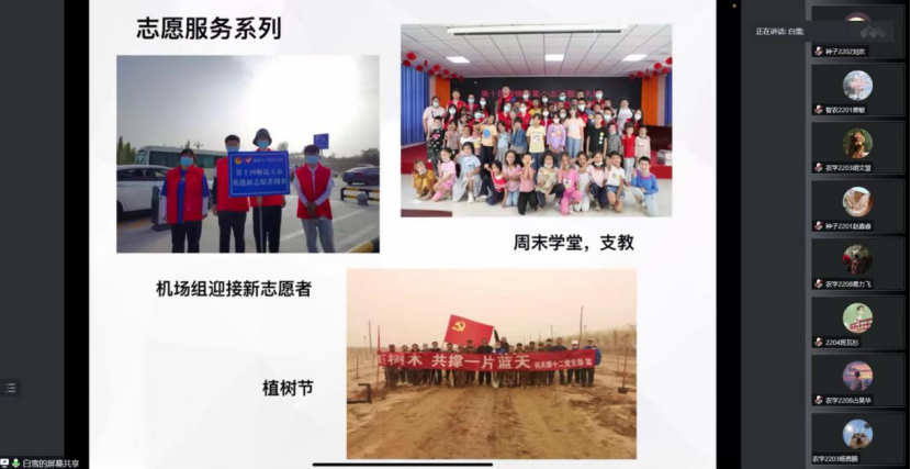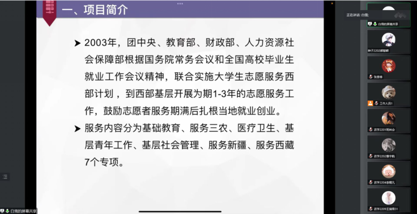 春华秋实又一载,砥砺奋进谱新篇。为保障党中央实施大学生志愿服务西部计划,贯彻乡村振兴战略有关部署,鼓舞同学们努力学习,安博官网体育于6月16日组织了线上“种下理想,又是一年风吹麦浪”奋斗者之路报告会。为此特别邀请2020届西部计划志愿者白雪展开了一场别开生面的介绍会,安博官网体育分团委副书记,20级辅导员张意奉莅临指导,召开此次会议。