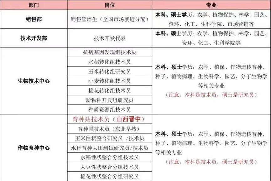 (2)营销方向(销售管培生、技术开发代表、产品经理管培生):农艺与种业、农学、植保、园艺、资环、生科、化学、市场营销等相关专业