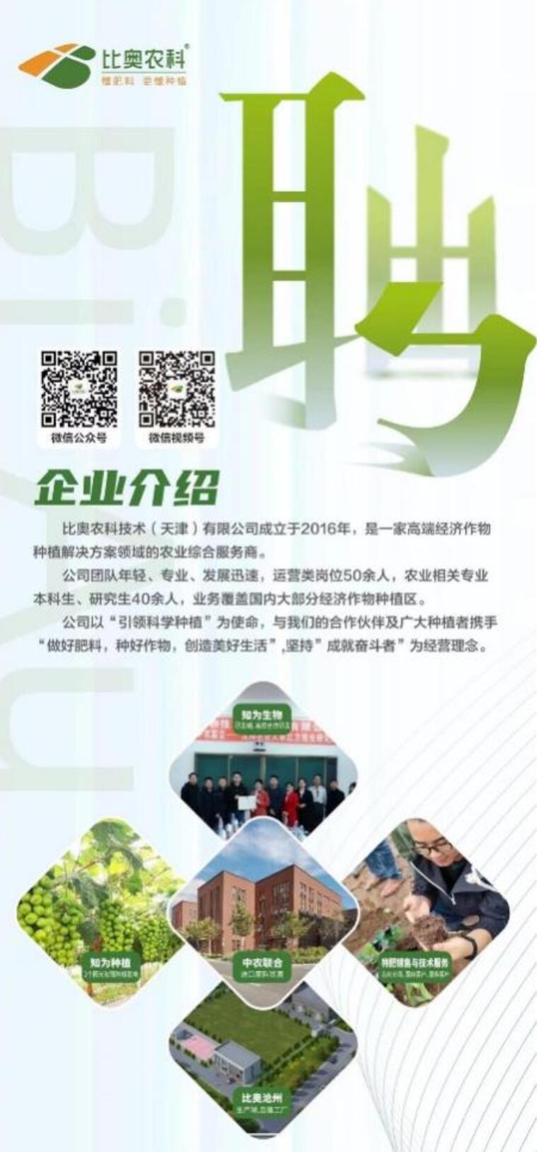 比奥农科技术(天津)有限公司隶属于天津中农联合农业科技有限公司,成立于2016年,是一家高端经济作物种植解决方案领域的农业综合服务商。公司由一支年轻的专业化团队组成,运营类岗位50余人,农业相关专业本科生、研究生50余人,业务覆盖国内大部分经济作物种植区。