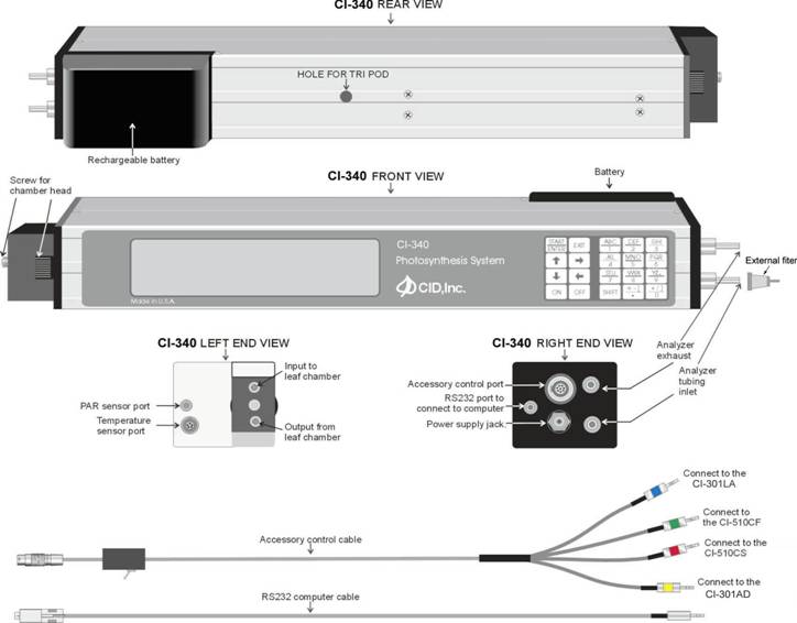 CI-340是一款技术上先进的光合作用系统。图2-1是系统的内部气路。它包含气泵、组合电磁阀和电子流量计。流量可由用户来设定,并由嵌入式的微型处理器调节。图2-2是CI-340光合作用系统的主机组成。