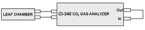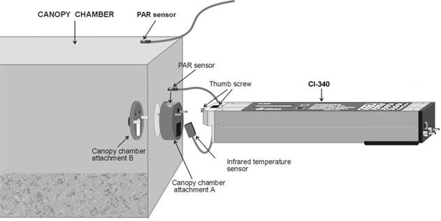 现在,将群体叶室的接口与CI-340连接,小心地将接口A部分的两个连接铜管插入CI-340前端,并且拧紧螺栓。将红外温度探头紧紧的插入接口A部分的方形深槽处,电缆线的插头插入CI-340前端的5芯的插空中。最后,将PAR传感器放到接口A或叶室顶上。 如果群体叶室使用的