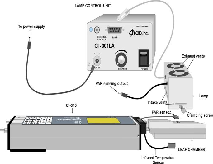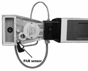 光源还连有一个带插头的小电缆,这是光源内部PAR传感器的输出。安装时,要确保光源覆盖整个窗口面积,这样,光源内部的PAR传感器和外部的PAR传感器都可以使用。建议将光源上的PAR传感器代替外接PAR传感器插入到CI-340的PAR插孔中,这样外部的传感器就没有必要了。