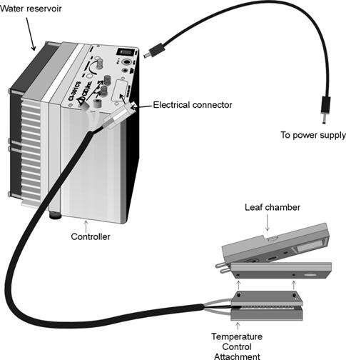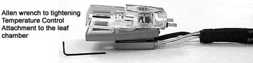 该控温附件只能用于开路叶室。在温度控制板与叶室连接之前,用一两滴水湿润一下两个连接面会改善其热传导状况。将温度控制板上的两个螺丝对准叶室下面的两个螺孔,并用附带的爱伦板手将其拧紧(参见图A-4和A-5)。红外叶温传感器也应该插入叶室下面相应的孔内。