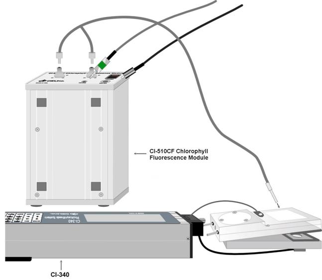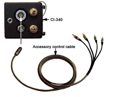 附件控制电缆上带有不同颜色标志的插头对应各附件的相应插孔。带有红色标志的是CI-510CS温度控制附件的插头,带有蓝色标志的是CI-301LA光控附件的插头,带有绿色标志的是CI-510CF叶绿素荧光测量附件的插头,带有黄色标志的是CI-301ADCO2和H2O调控附件的插头。