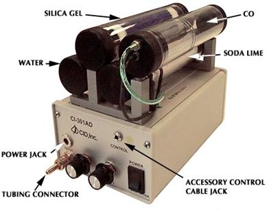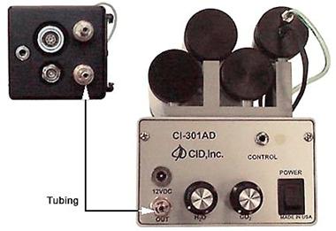 CI-301AD可通过CO2 发生片和碱石灰调整气源的CO2浓度,调整范围大约为0~1000ppm、流量≤0.37升/分钟。相对湿度通过硅胶和水来控制,大约从5%到超过周围环境湿度20~30%范围内。