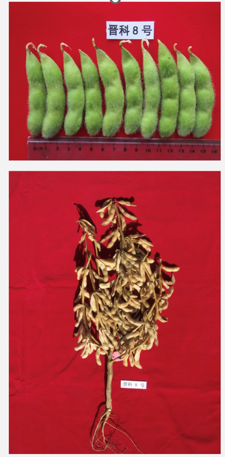 晋科8号作为鲜食菜用大豆新品种,株高适中、分枝多、结荚密、茎杆壮、抗倒伏,抗大豆花叶病毒,耐大豆孢囊线虫病,采摘期103.5天。其干籽粒,呈椭圆、种皮呈黄色、有光泽、脐色为褐色。在其鲜食期,荚鲜绿,茸毛灰色,鲜荚宽达1.55cm,长达7.55cm,鲜百粒重88.57g,干百粒重47.1 g,具有极好的商品性。口感品质好,口感香甜柔糯,口味浓香微甜,口感评价为 A 级;外观品质好,茸毛浅灰色,鲜荚翠绿,口感和外观品质综合评价为Ⅱ级。2018年经农业部谷物及制品质检中心(哈尔滨)分析测试:蛋白质含量44.08%,高于国家高蛋白质优质标准(≧ 43%)1.08%,脂肪含量19.98%,双项合计64.06%,高于国家蛋白+脂肪双项合计优质标准(≧63%)1.06%。