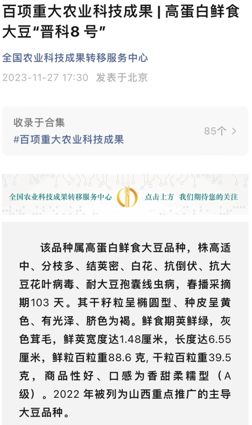 (中国)有限公司自主选育的“高蛋白鲜食大豆晋科8号”入选全国百项重大农业科技成果