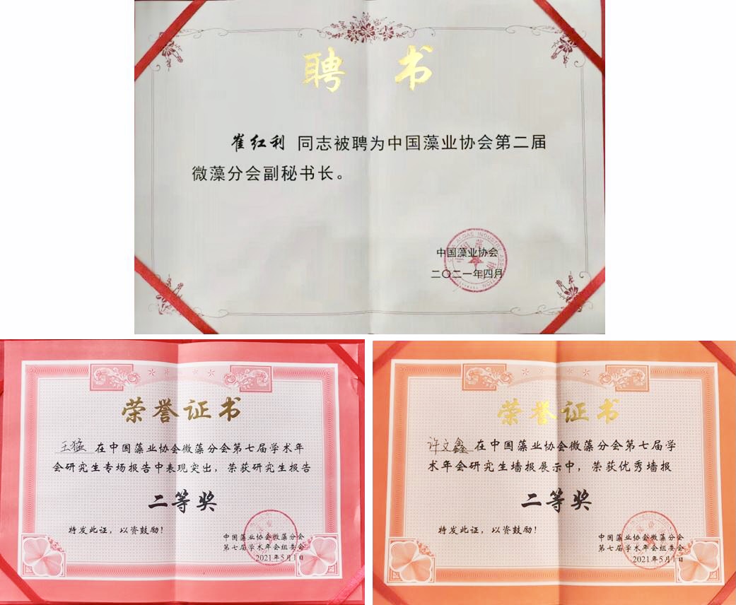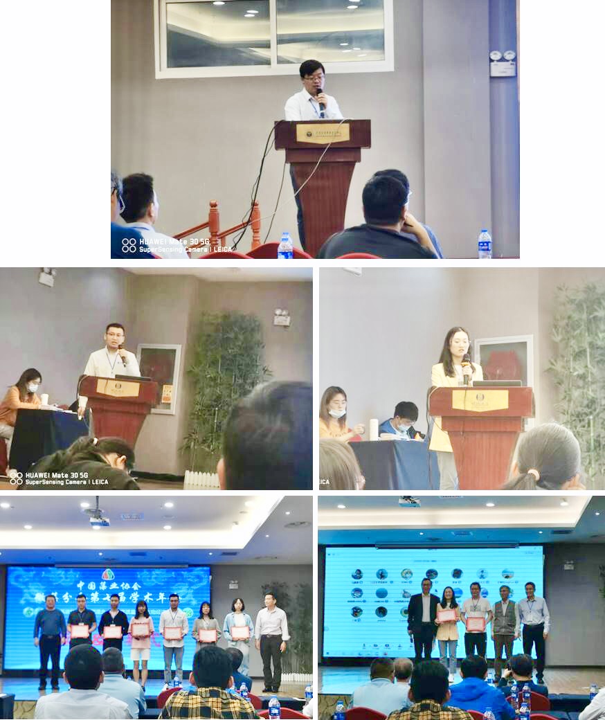 (中国)有限公司功能微藻团队崔红利副教授带领王猛和许文鑫两位硕士研究生参加了大会并作报告。崔红利副教授做了题为“藻源活性物质(螺旋藻多糖和虾青素)精准功能鉴定”的学术报告。硕士研究生许文鑫和王猛在研究生论坛分别做了“紫外光诱导雨生红球藻虾青素积累的光信号通路分析”和“雨生红球藻源虾青素通过调节肠道菌群和脂代谢缓解高脂饮食诱导的小鼠肥胖症”的报告,其中王猛荣获研究生论坛报告二等奖,许文鑫获研究生墙报二等奖,崔红利副教授被聘为中国藻业协会微藻分会第二届微藻分会副秘书长。