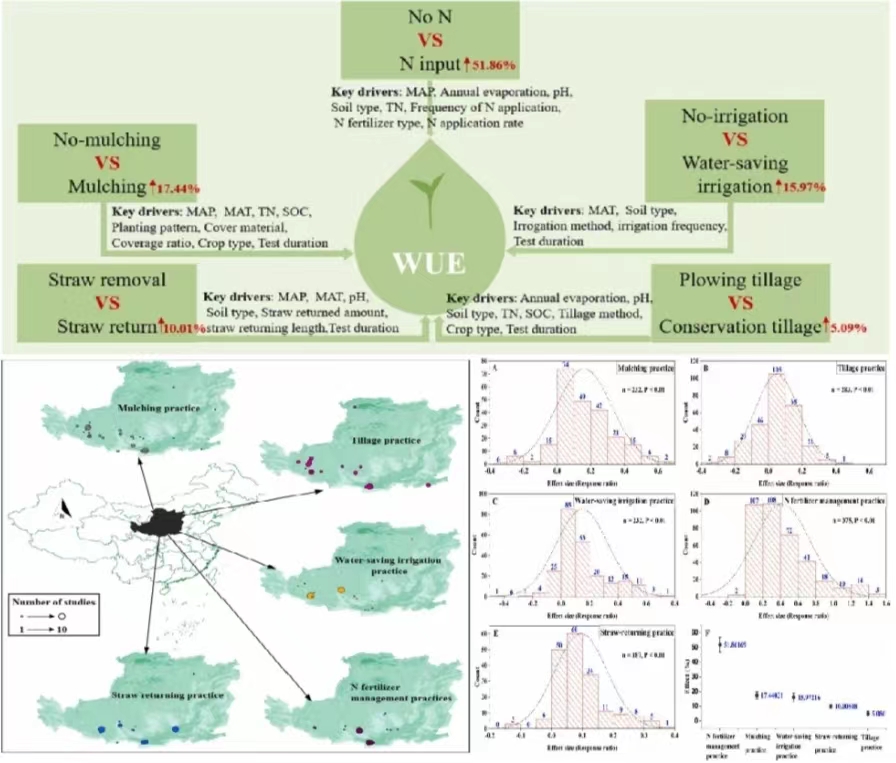 该研究成果以“Quantifying the impacts of agricultural management practices on the water use efficiency for sustainable production in the Loess Plateau region: A meta-analysis”为题发表在Field Crops Research期刊(中科院1区Top)上,采用整合分析(meta-analysis)量化了黄土高原区不同农艺管理措施(氮肥管理、覆盖管理、节水灌溉、秸秆还田以及保护性耕作)对作物WUE的影响(图1),并确定了影响各农艺措施效应的关键因素,该研究结果有助为该区域农业高效用水和可持续生产提供参考。