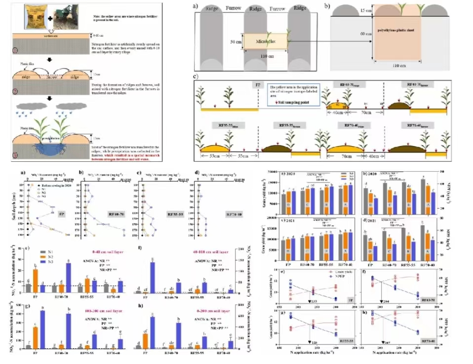 该研究成果以“Optimizing nitrogen fertilizer application to improve nitrogen use efficiency and grain yield of rainfed spring maize under ridge-furrow plastic film mulching planting”为题发表在Soil and Tillage Research期刊(中科院1区Top)上,研究采用氮同位素示踪技术确定了不同垄沟带型下肥料氮的归宿(图2),进而为确定垄沟覆膜种植下合理施氮方式提供了参考。