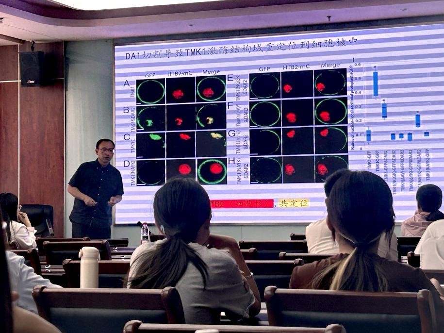 报告中,顾教授主要围绕DA1调控器官发育和逆境反应的机理,以及DA1介导植物激素信号转导的分子机理进行讲解,尤其是从DA1及其基因家族的发现、表型特征及功能验证、基因挖掘及调控,抽丝剥茧,层层深入,并结合具体实验数据和案例,阐述了其在植物生长发育和应对逆境过程中的关键作用。顾教授的报告内容丰富、深入浅出,不仅让师生们对植物科学研究有了更深入的了解,也激发了同学们对科学研究的浓厚兴趣。