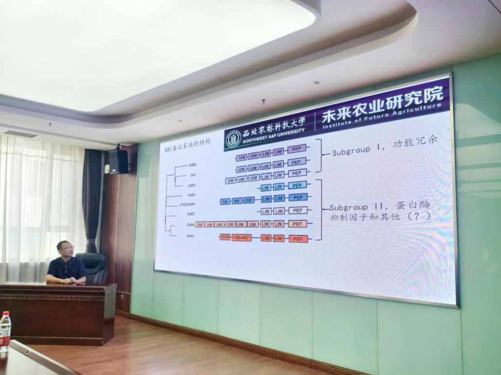 5月19日,西北农林科技大学未来研究院的博士生导师顾本国教授,应邀参加我校根土互作与特优农业导学团队的研究生学位论文答辩。并在勤学楼316会议室作了题为“DA1肽酶的功能研究”学术报告。根土互作与特优农业导学团队和棉花远缘杂交导学团队的师生们以及农学2210(卓越人才班)的同学们参加了本次报告会。会议由团队负责人、功能农业系主任杨珍平教授主持。