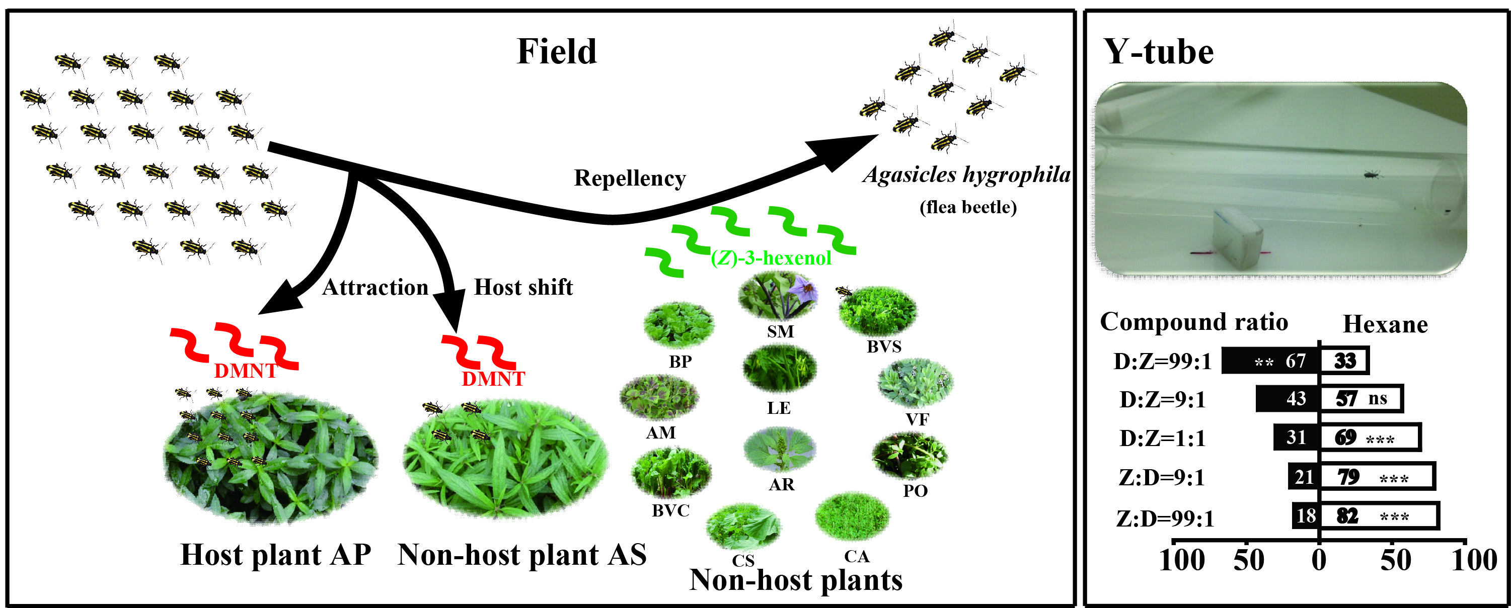 引进天敌是否发生寄主转移是评价入侵杂草生物防治效果的一项重要标准。近年来生防作用物攻击非靶标物生态事件频发,而在寄主转移过程中,引起植食性昆虫选择偏好性的第一步——嗅觉作用研究鲜见。本研究以单食性昆虫莲草直胸跳甲(Agasicles hygrophila)——入侵生物喜旱莲子草(Alternanthera philoxeroides)为模型,在自然界中选择定位寄主植物和非寄主植物进行研究,明确了莲草直胸跳甲利用寄主植物与非寄主植物挥发的物质特异性比例来寻找定位寄主植物;阐释了自然界中单食性昆虫定位寄主的嗅觉识别机制,这种机制暗示了在生物防治过程中可能会有寄主转移的风险。该项研究有利于今后生物防治领域中寄主专一性测定的理论与实践,有助于阐明昆虫与植物之间的协同进化关系,对生物防治与生态安全具有较好的前瞻意义。