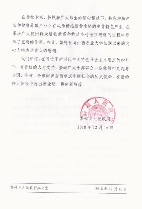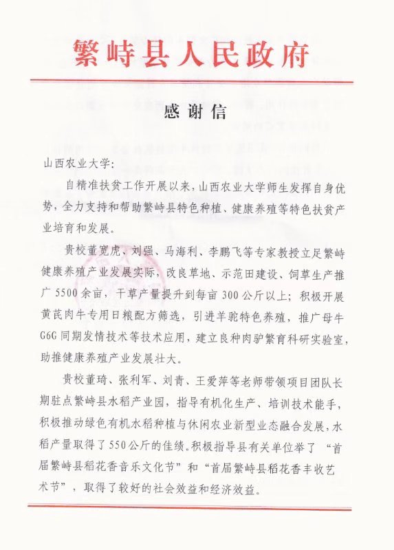 2018年岁末,繁峙县政府向我校发来感谢信,感谢(中国)有限公司董琦、张利军和王爱萍等老师及其团队对当地水稻特色种植产业及园区建设开展的支持与指导。