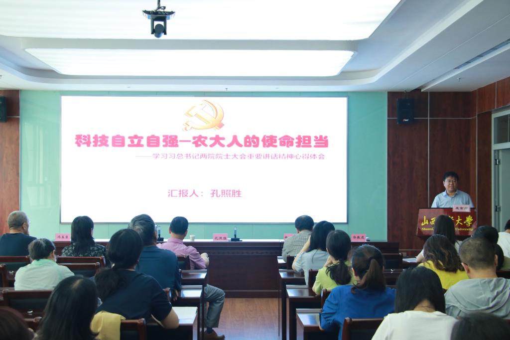 孔照胜主要从中国共产党全面领导与伟大科技成就,百年未有之大变局与新一轮科技革命,国家创新体系与高水平科技自立自强,农业科技自立自强,向袁隆平学习等五个方面进行了讲授。他旁征博引,娓娓道来,从“两弹一星” 到“杂交水稻”,从“天眼”巡空到“天问”探火,从为神舟十二号成功发射的航天人到坚信一粒种子可以改变世界的袁隆平。孔照胜鼓励青年教师要仰望星空,拥抱新的技术,也要脚踏实地,向老一辈科技工作者学习,把个人理想与国家发展、社会的进步结合起来,抓住机遇,乘势而上,发出山西农大自己的声音。