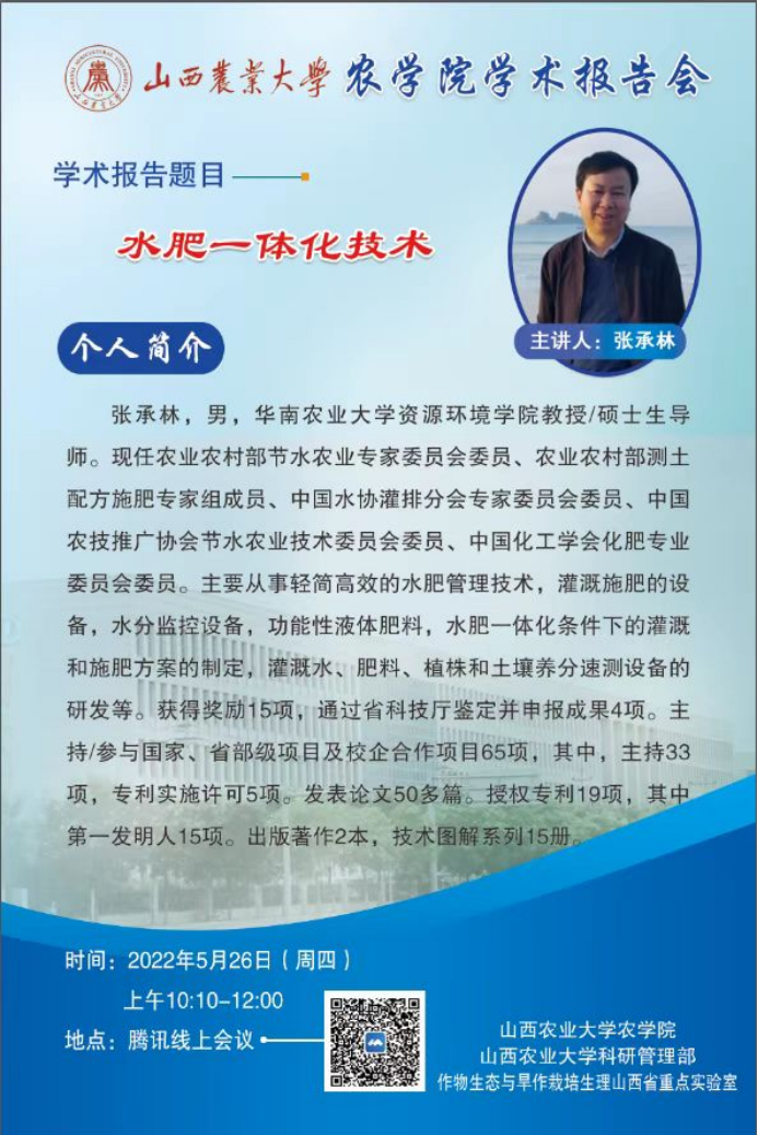 张承林教授做了《水肥一体化技术》的学术报告。报告从水肥一体化技术的普及推广程度,水肥一体化技术的具体实施,到最后水肥一体化技术的常用化肥,系统而又详细的介绍了水肥一体化技术这一全新的施肥理念。同时也具体介绍了不同水肥一体化设施的优缺点以及不同水溶肥的类型。通过报告让大家全面认识了水肥一体化技术,也利于作物栽培学的进一步发展。