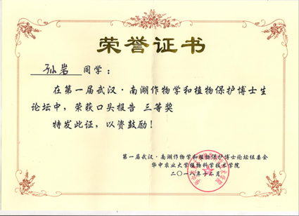 12月7日—9日,第一届武汉·南湖作物学和植物保护博士论坛在华中农业大学召开。我校安博官网体育作物学博士研究生孙岩应邀参加论坛,他所作的《楂物营养器官富集油脂的整合代谢工程》报告,获大会口头报告三等奖。(安博官网体育)
