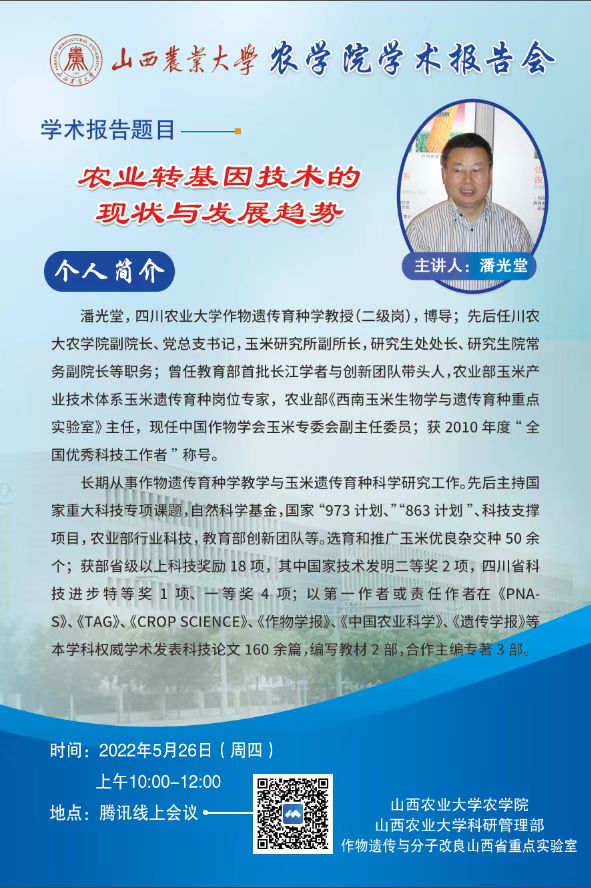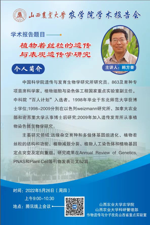 各位老师: 5月26日(本周四)上午8:30-12:00,安博官网体育邀请到中国科学院韩方普研究员、中国农业大学王志敏教授、四川农业大学潘光堂教授、华南农业大学张承林教授、做线上学术报告会,欢迎各位老师和学生们积极参会!
