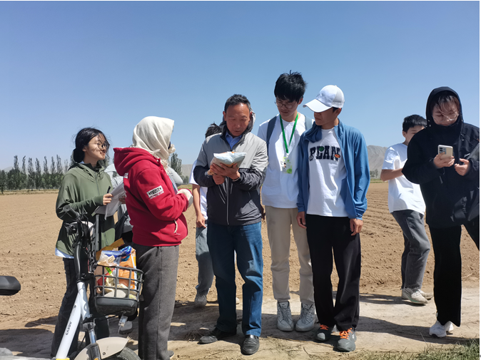 草帽知行团队在崔老师的带领下,走进了田间地头。遇到了几位农民在使用机器撒化肥,崔老师带领学生去调查化肥的撒施方式,并与这几位农民进行了交流。学生详细记录了农民玉米种植面积与生产资料投入情况,并且向他们分发了玉米种植技术手册,鼓励他们用笔和笔记本将玉米生产情况记录下来。