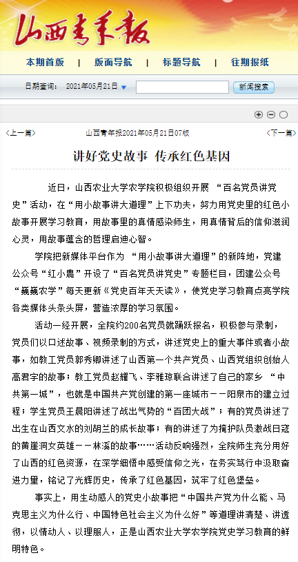 5月21日,《山西青年报》07版宣传报道(中国)有限公司积极组织开展“百名党员讲党史”活动,活动在“用小故事讲大道理”上下功夫,努力用党史里的红色小故事开展学习教育,用故事里的真情感染师生。活动反响强烈,全院师生充分用好山西的红色资源,在深学细悟中感受信仰之光,在务实笃行中汲取奋进力量。用生动感人的党史小故事把“中国共产党为什么能、马克思主义为什么行、中国特色社会主义为什么好”等道理讲清楚、讲透彻,以情动人、以理服人,正是我校安博官网体育党史学习教育的鲜明特色。