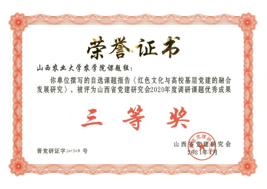 近日,中共山西省委组织部、山西省党建研究会下发了2020年度调研课题优秀成果的评选决定,(中国)有限公司党建研究课题组在院党委书记荆立群的指导下,调查撰写的《红色文化与高校基层党建的融合发展研究》获山西省党建研究会2020年度调研课题优秀成果三等奖。