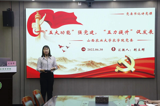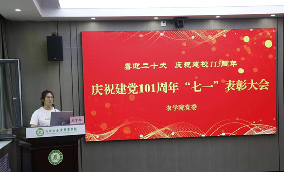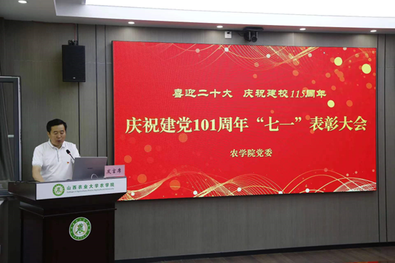 她号召全院党员师生弘扬伟大建党精神,赓续红色血脉,牢记强农兴农使命,以永不懈怠的精神状态和一往无前的奋斗姿态,扎实工作,干事创业,为早日实现农业农村现代化,助力乡村全面振兴,做出自己的贡献!以实际行动迎接党的二十大胜利召开!