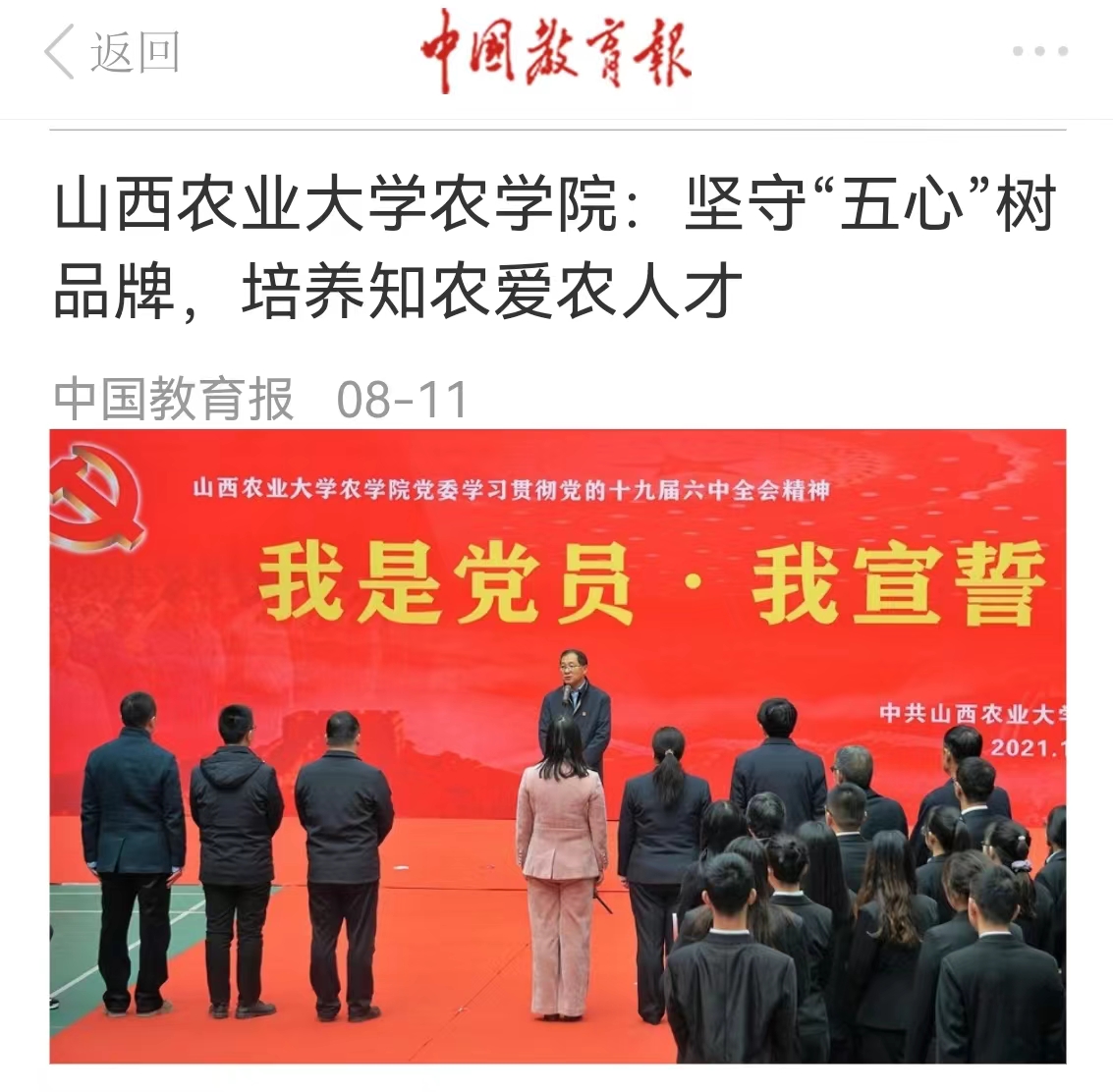 在党的二十大即将召开之际,2022年8月11日,7月21日,中国教育报客户端刊登安博官网体育党建创新案例《坚守“五心”树品牌,培养知农爱农人才》。安博官网体育党委立足自身实际,引领全院广大党员,坚守红心向党、爱心育人、真心爱农、热心知农、信心强农,通过开展以传承红色基因、激发青春能量、担当兴农使命为主要内容的“红色•青春•兴农”党建品牌创建,切实强化党建工作与学院教学、科研、社会服务相融合,传承红色基因,不忘强农兴农初心,勇担服务“三农”使命,助力乡村振兴和农业现代化建设,探索出一条新时代涉农高校基层党委培养知农、爱农、强农、兴农新型人才的成功经验。