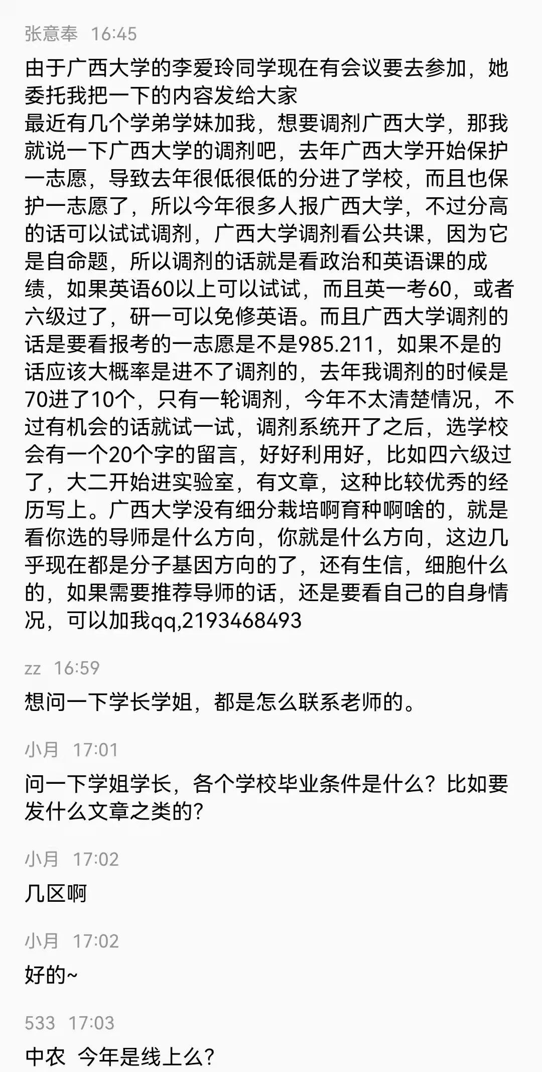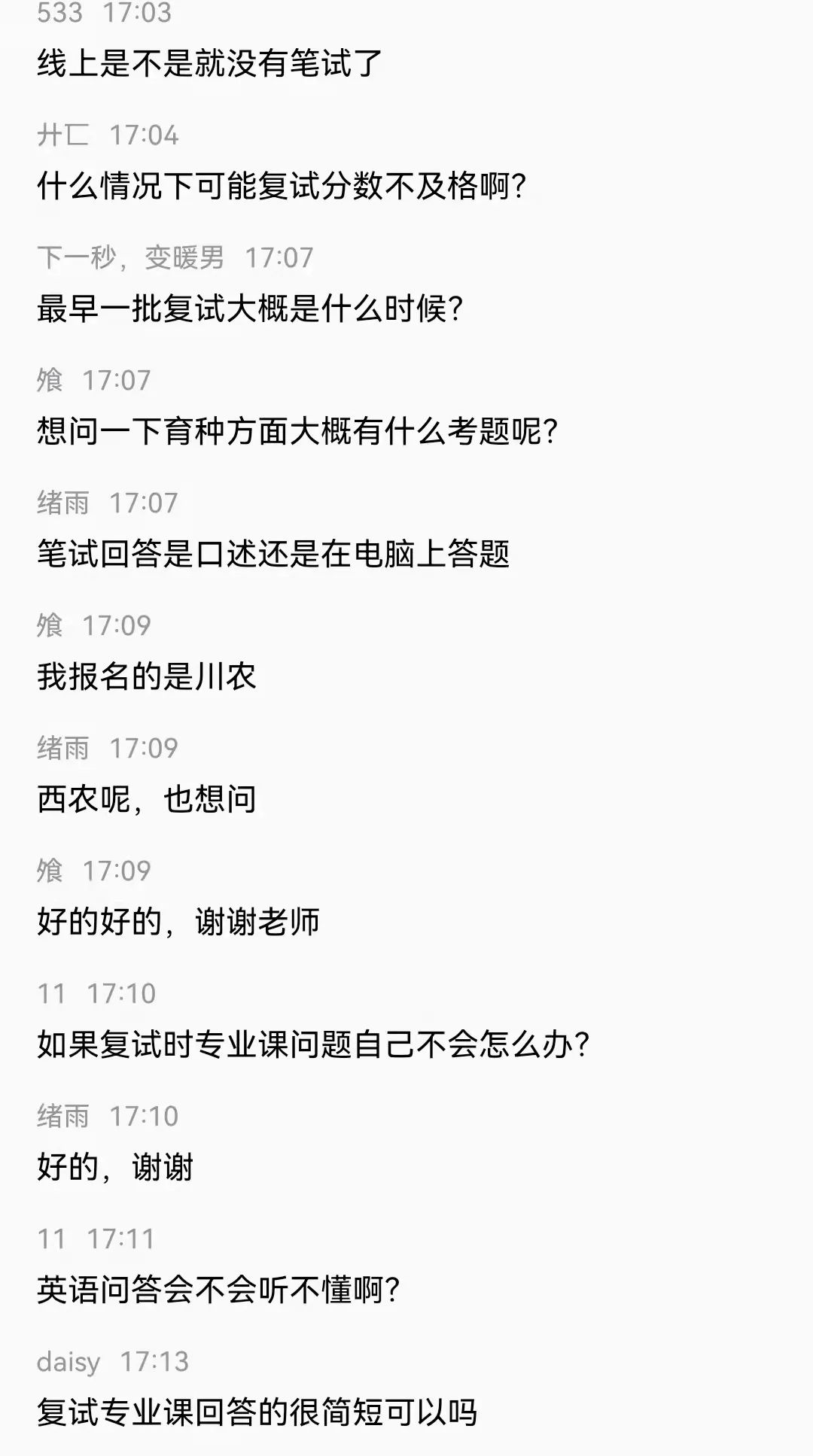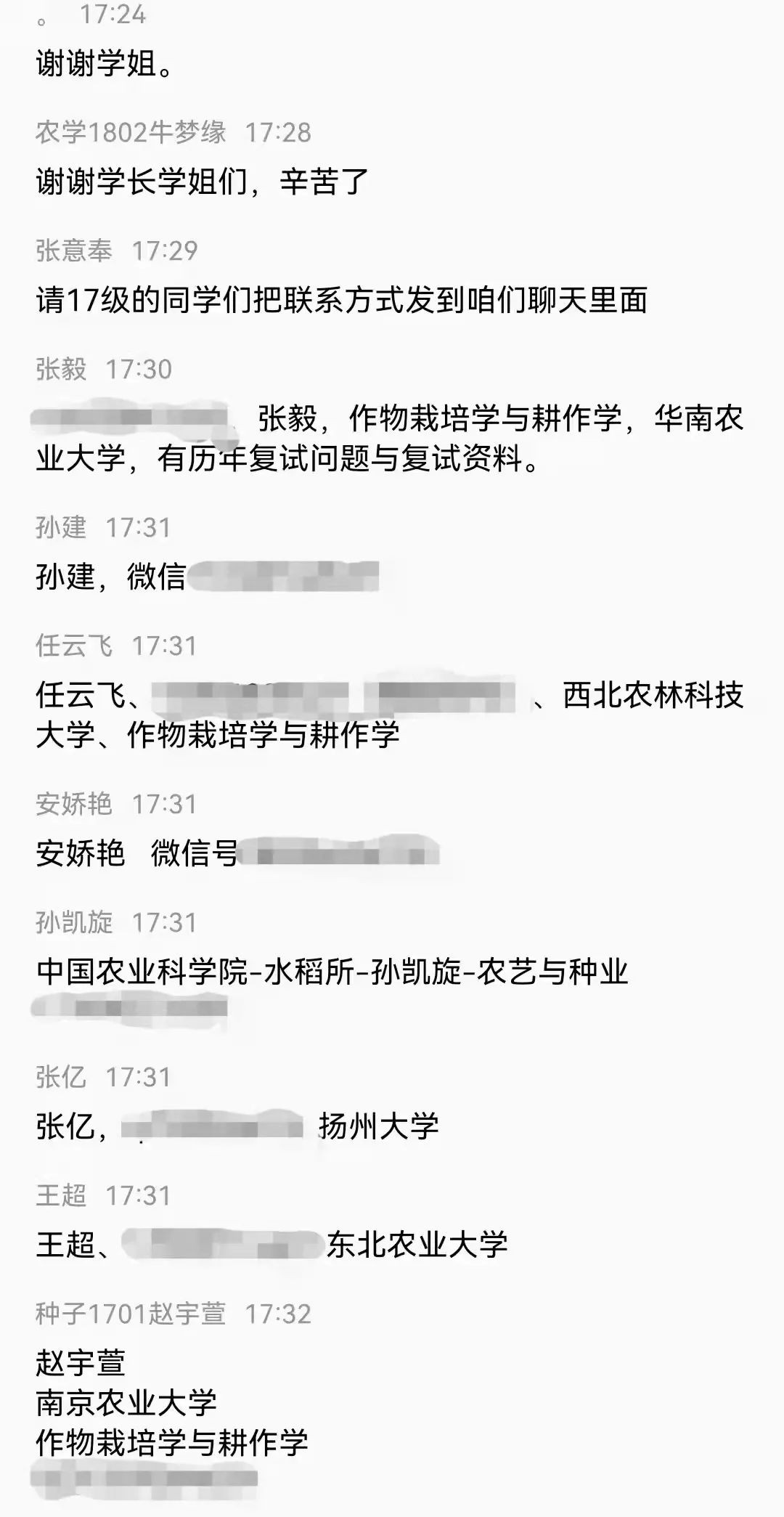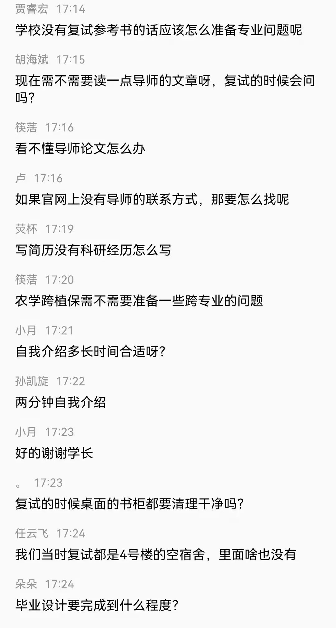 本次会议邀请到了现就读于中国农业大学的张建珍和安娇艳、西北农林科技大学的任云飞、南京农业大学的赵宇宣、华中农业大学孙建、华南农业大学张毅、东北农业大学王超、福建农林大学曾康、广西大学的李爱玲、中国农业科学院的孙凯旋、海南大学的智博洋、扬州大学的张亿等农林类高校的12位2021届学长学姐为即将复试的毕业生分享经验。