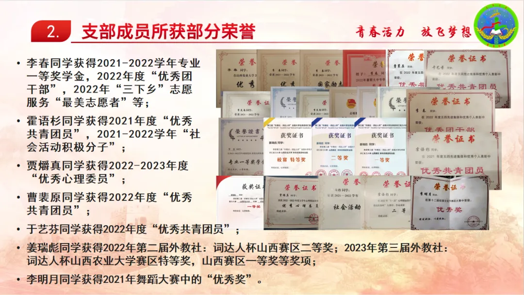 为深入贯彻落实“全团大抓基层”,深化高校共青团改革,11月中旬,我校团委开展了“四进四信 筑梦青春”系列活动——活力团支部及百佳团支书评选。(中国)有限公司农学2107班凭借优异的表现荣获“活力团支部”二等奖。