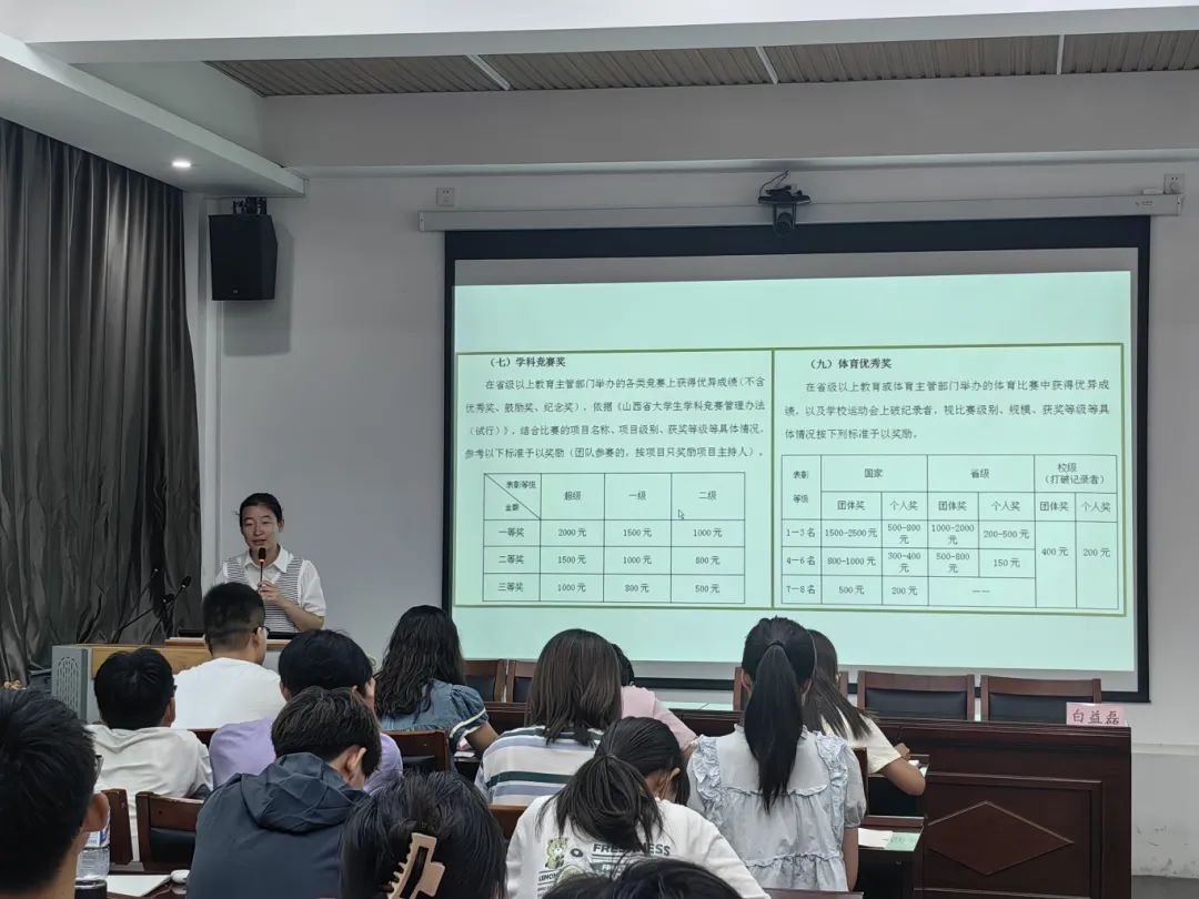 辅导员李蕾讲解奖助学金评选办法。她就各类助学金、奖学金的评定条件及流程为同学们作了详细解读,明确标准,确保评选工作的公平、公正、公开,鼓励同学们积极参与各项活动,明确自己的奋斗目标。